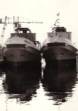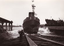 Twee sleepboten, deΒ Jacques Letzer en zusterschip Wielingen,Β na stapelloop van op de scheepswerf Beliard-MurdochΒ in het Zwaaidok.