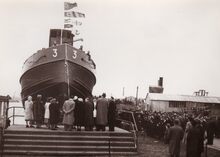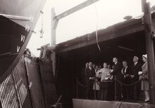Doop door de meter van de sleepboot Jacques Letzer op de scheepswerf Beliard-Murdoch. Centraal achter de meter visserijaalmoezenier Jan CORNEILLIE en rechts van hem volksvertegenwoordiger Dries CLAEYS.