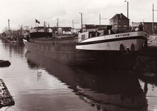 Het rijnschip (binnenlander) Arthur na zijn tewaterlating gemeerd aan de Hendrik Baelskaai.