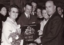 Scheepsbouwer JozefΒ DEWEERT overhandigt een memento aan de meter van van de O.101Β Benny na de doop en tewaterlating van hun vissersvaartuig. Centraal schipper Gilbert VIAENE, die verschillende malen garnaalkoning was, met zijn echtgenote Maria RASSAERT.