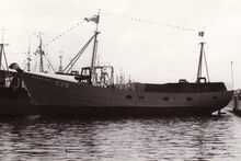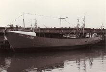 De zopas tewatergelaten O.198 Juhel bij de vismijn in het Visserijdok. Stalen motortreiler gebouwd op de scheepswerf Deweert voor de rederij JuhelΒ PVBA.
