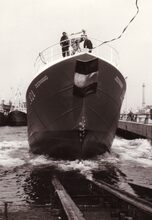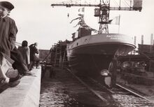 De O.307 "Verdi" loopt van stapel in het Visserijdok. Stalen motortreiler gebouwd op de scheepswerf J. Deweert voor rekening van de rederij PVBA De Noordzee