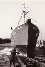 De Duc de Normandie F1040 na haar tewaterlating op de scheepswerf Beliard-Crighton & C° aan het Zwaaidok. Motortreiler gebouwd voor de reder A. Ledun (Fécamp) (Frankrijk). Het vissersvaartuig is vergaan op 21 februari 1951 tijdens een zware storm in de Noordzee. Lat. 51°25.517'N - Long. 2°36.339'E. Van de 26 bemanningsleden konden er slechts 2 gered worden.