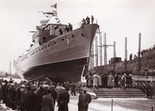 De Marseillais 3 loopt de helling af aan de scheepswerf Beliard-Crighton & CΒ° aan het Zwaaidok.