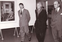 Kunstschilder Paul Delvaux op zijn tentoonstelling in het Museum voor Schone Kunsten in het Feestpaleis met Roger De Kinder, schepen (links) en eerste minister Théo Lefèvre