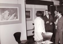 Bezoekers aan de tentoonstelling van Willy Bosschem in het Casino-Kursaal. Links de kunstenaar in gesprek met Raoul Servais.