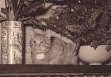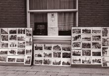 De heer ...... VALCKE uit de Leffingestraat,toont foto's van de eerste wereldoorlog (en zijn eretekens) aan zijn woning.