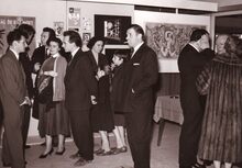 Kunstschilder Frans RegoudtΒ op zijnΒ tentoonstelling.Β Vooraan bij de deur, Silvio Romano, eveneens kunstschilder Γ©n collega leraar tekenen van Frans RegoudtΒ in het Koninklijk Atheneum (Oostende)