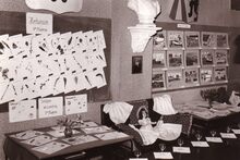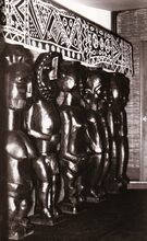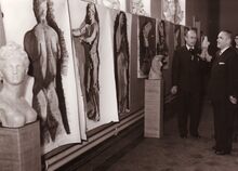 Vernissage van de tentoonstelling. "In de vroege vijftiger jaren kreeg Emile Bulcke van het Oostendse stadsbestuur de belangrijke opdracht een nieuwe reeks portretten van Oostendse burgemeesters te vervaardigen. De bestaande serie in het stadhuis verdween in de vlammen toen het gebouw in 1940 door brand vernield werd. Voor Bulcke was het zeker geen gemakkelijke opdracht, vooral daar waar het portretten van oudere personaliteiten betrof : wΓ Γ r van deze mensen nog een betrouwbaar portretmodel gehaald ?. Hij nam de opdracht zeer ter harte : maandenlang verichtte hij opzoekingen en navragingen om aan gegevens van de overleden burgemeesters te geraken. Hij wou hun conterfeitsels zo precies en natuurgetrouw mogelijk. Op zaterdag 30 juni werd de suite officieel voorgesteld in de leeszaal van het nieuwe Kursaal. Op genoemde tentoonstelling was ook het beeld "De Wind" te zien". In : Emile Bulcke : kunstschilder-beeldhouwer 1875-1963 / Norbert Hostyn. 1989. p.13. Plate bib Β B620
