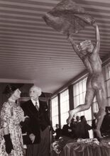 Emile Bulcke bij zijn sculptuur "De Wind" tijdens de vernissage. Het in brons gegoten werk schonk hij aan zijn geboortestad Oostende, als blijk van erkentelijkheid voor de belangrijke bestelling die bij hem geplaatst werd.