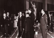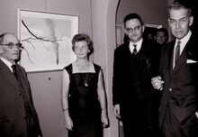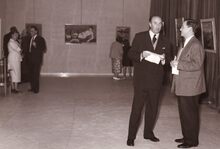 Opening van een tentoonstelling in het kursaal.Links staat de kunstenaar,rechts burgemeester Adolf VAN GLABBEKE en zijn echtgenote.