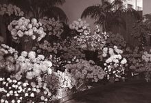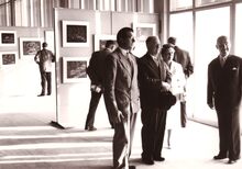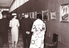Burgemeester Adolf VAN GLABBEKE en een paar vrouwelijke Japanse genodigden op een tentoonstelling van de "Koninklijke Kunstkring Oostende" in de Koninklijke Gaanderijen
