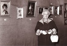 Een kunstenaresΒ voor haar werken (?). Tentoonstelling van de "Koninklijke Kunstkring Oostende" in de Koninklijke Gaanderijen