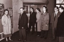 Kunstschilder Jan DE CLERCK (tweede van rechts) met naast hem Roger DE RAMEE en burgemeester Jan PIERS op een tentoonstelling in het Kursaal. Naast Jan PIERSΒ staat een jonge Yves RHAYE. Zesde van links : beeldhouwer Gerard HOLMENS.