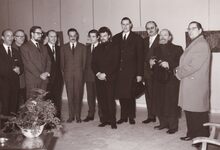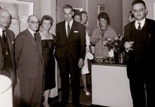 Formaat : 13 x 18 cm. - Vernissage van de tentoonstelling in de leeszaal van het Casino-Kursaal van de portretten van 16 burgemeesters van Oostende en het beeldhouwwerk "De Wind". Links, Emile Bulcke. Uiterst rechts, Roger De RamΓ©e,Β kursaalconcessionnaris. Vooraan van rechts naar links, burgemeester Adolf Van Glabbeke en de schepenenΒ Jan Piers, Maurice Quaghebeur sr. en Kamiel Dehouck.Β