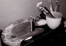 Opening tentoonstelling van kunstschilder Frans RegoudtΒ in zijn eigen kunstgalerij "De Kwinte", Vlaanderenstraat 35. Van links naar rechts,Β Marie-Jozef Porta, schepen, onbekende,Β mevrouw Regoudt, Frans RegoudtΒ en Frank Edebau, stadsconservator. Frans RegoudtΒ was ook leraar tekenen aan het KoninklijkΒ Atheneum (Oostende)