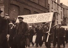 De vissers in de 1-meistoet 1947 op de Torhoutsesteenweg, hoek Koninginnelaan. Zij dragen een bord met de tekst : "... Visschers eischen ... speciaal Statuut"
