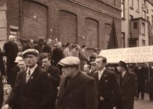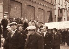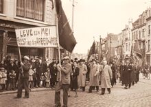 Een afvaardiging van de BSP Bredene met burgemeester August PLOVIE (eerste links op tweede rij) in de 1-meistoet 1947 op de Alfons Pieterslaan. Er wordt een bord gedragen met de tekst : "Leve een Mei. Feest van den Arbeid en Vrede".