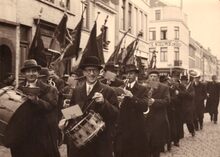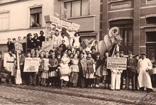 Een afdeling van de "Rode Valken" staat klaar in de Jules Peurquaetstraat, toen Veldstraat, om op te stappen in de 1-meistoet 1947. De verwijzing op de wagen is naar Staf DECLERCQ, leider V.N.V. en naar Leon DEGRELLE, leider van R.E.X., twee topcollaborateurs met de Duitse bezetter.