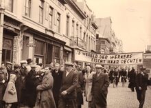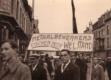 De 1-meistoet 1947 op de Alfons Pieterslaan. Er wordt een bord gedragen met de tekst : "Metaalbewerkers eischen meer welstand"