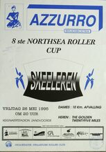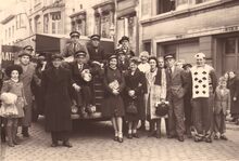 Een groep wielrijders van "Ostend Stadion" op het Wapenplein tijdens de Carnavalstoet. Rechts de Kerkstraat. Let op de vernielingen, nog altijd zichtbaar, door de Duitse bombardementen in het begin van de Tweede Wereldoorlog.