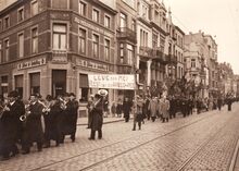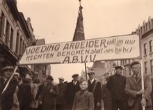 De 1-meistoet 1947 op de Alfons Pieterslaan. Er wordt een bord gedragen met de tekst : "Voeding Arbeider wilt gij uw rechten bekomen sluit aan bij het A.B.V.V.".