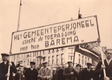 Het gemeentepersoneel in de 1-meistoet 1947 op de Alfons Pieterslaan. Er wordt een bord gedragen met de tekst : "Het Gemeentepersoneel eischt de toepassing van hun Barema".