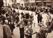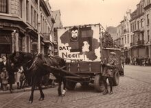 Een wagen nog getrokken door een paard, in de 1-meistoet aan het kruispunt Petit Paris.Verwijzing, het is nog kort na het einde van de Tweede Wereldoorlog, naar Staf DECLERCQ en Leon DEGRELLE, dé twee leidende collaboratiefiguren.