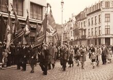 Een afdeling van de "Rode Valken" in de Jules Peurquaetstraat klaar voor de 1-meistoet 1947. Achteraan staat naast de vlag en met hoed burgemeester August PLOVIE van Bredene.