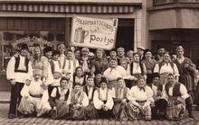 Een muziekgroep uit Gent (?), met vaandels, uit de carnavalstoet op de trap van het dd. stadhuis (huidig gerechtshof) aan het Canadaplein. De grote halfvastenstoet van 16 maart 1947 bestond uit 40 groepen, 15 praalwagens en 6 muziekgroepen.
