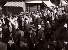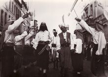 Rechts, volkzanger Bertino met zijn wandelend orkest.Β