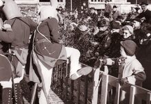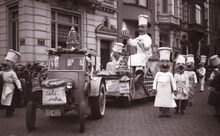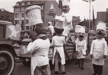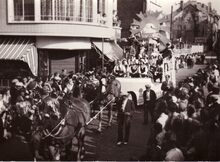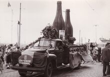 De Oostendse carnavalgroepΒ "Bakkerij La Couronne", met praalwagen tijdens een halfvastenstoet in de Leopoldlaan tegenaan de hoek metΒ de Karel Janssenslaan.