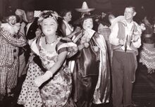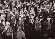 Cowboys en -girls, een carnavalvereniging uit Kortrijk in de halfvastenstoet op het Wapenplein. Er is nog veel puin te zien uit de Tweede Wereldoorlog.