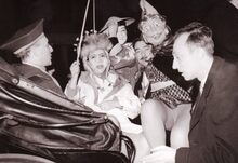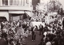 Schepen Roger DE KINDER, met snor, in een open koets,Β in de verdrukking tijdens een cimateirestoet. Feestdirecteur Fred RIGAUX (rechts) tracht hem te ontzetten.