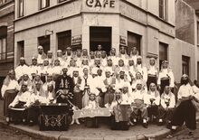 Carnavalgroep van de bakkerij "La Couronne" met zotskap voor de Patisserie-Confiserie "La Couronne", Torhoutsesteenweg, nabij het MacLeodplein.
