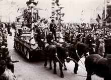 Een praalwagen getrokken door vier paarden met het Oostends koor "Het Loze Vissertje"Β in de Kapellestraat.