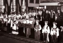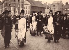 Een folkloregroep uit Nederland in typische klederdrachtΒ in de Kapellestraat, hoek Ooststraat.