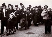 Formaat : 13 x 18 cm. - De folkloregroep "Het Huwelijk van Paul en Louise" uit BredeneΒ in de halfvastenstoet op de Visserskaai.