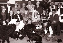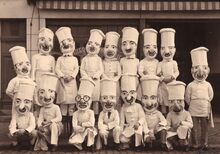 De bakkers, zonder zotskap, van de carnavalgroep "Bakkerij La Couronne"Β voor de Patisserie-Confiserie "La Couronne"Β aan de Torhoutsesteenweg (Mac Leodplein).