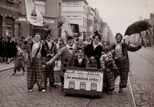 De carnavalgroepΒ "Het Wandelend Circus de Barnums" uit Ledeberg, met vlag en verkleed als clowns in de halfvastenstoet op de Torhoutsesteenweg bij de Leffingestraat (eerste hoek) en de Zwaluwenstraat.