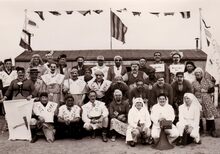 De Oostendse folkloristische vereniging "Ali Baba en de 40 Rovers" wordt ontvangen op het dd. stadhuis (huidig gerechtsgebouw).