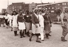 De folklorevereniging "Ali Baba en de 40 Rovers" in de Karel Janssenslaan. Β De achtergrondΒ rechts, het Leopoldpark.