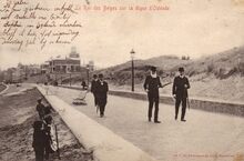 Koning Leopold II op wandel op de Zeedijk. Op de achtergrond, het Koninklijk Chalet.