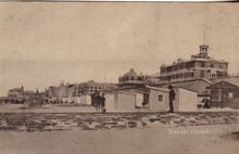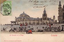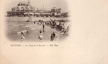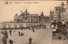 WandelenΒ op het GrootΒ Strand nabijΒ de westelijkeΒ gevel van het derdeΒ KursaalΒ langsΒ de Zeedijk. De burgerijΒ altijd modieusΒ gekleedΒ tijdensΒ de Belle Epoque.Β Rechts, de traditioneleΒ badkarrenΒ en de grote hotels. We zienΒ ook de jol van de strandreddingsdienst