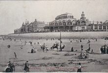 Het derdeΒ KursaalΒ tijdensΒ de verbouwing. De westelijkeΒ gevelΒ is nog nietΒ verbouwd. StrandrecreatieΒ op het GrootΒ Strand. Er wordenΒ emmertjes, schopjes en vlaggen verkocht.