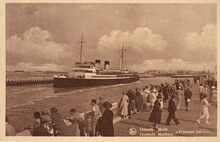 De pakketboot Prinses Astrid in de havengeul van Oostende. Veel volk op het Weststaketsel. Op de achtergrond, het Ooststaketsel en de Oosteroever.