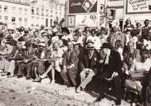 De personaliteiten wachten op de doortocht van de bloemencorso op het Wapenplein. Op de achtergrond de Kerkstraat. We herkennen, tweede van links schepen Emiel VROOME, naast hem burgemeester Henri SERRUYS, mevrouw SERRUYS, mevrouw VAN GLABBEKE, Adolf VAN GLABBEKE en kunstschilder Emiel BULCKE