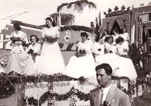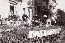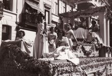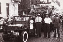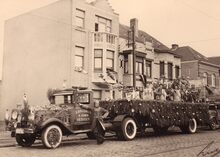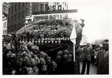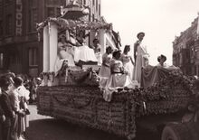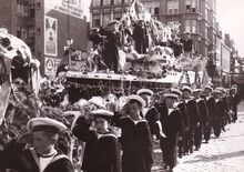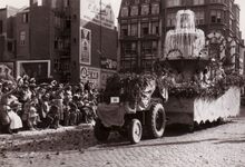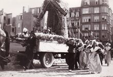 Leerlingen van het Koninklijk Werk IBIS rond deΒ praalwagen "Car-Ferry" van het Zeewezen in de bloemencorso van 1950 op het Wapenplein.