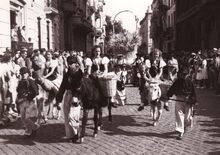 Een groep kinderen op ezels in de Sint-Peterburgstraat, in 1953 gewijzigd in Leon Spilliaertstraat