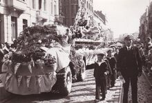 Praalwagen nr.6 getrokken door twee paarden in de Van Iseghemlaan aan de hoek met de Sint-Peterburgstraat.